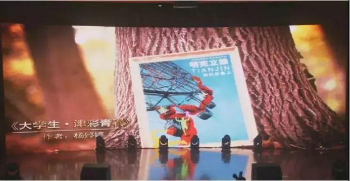 该作品创意独特,用天津之眼突出地域文化,在天地间舞动起象征宪法的红色丝带,巧妙地以人物剪影穿行期间,寓意当代老员工在法治建设中的先锋力量,具有较强的视觉冲击力和艺术感染力。该作品获得组委会高度认可,并由团市委副书记于中鹏为该作品领奖代表,为2017级1班杨婷婷同学授予天津市一等奖荣誉。
