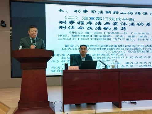 刑法教研室主任王海军教授作为与谈人,进行了深入的交流和探讨。王海军教授对喻海松副主任在刑事司法解释领域所展现的深厚学术功底、丰富实践经验以及全面系统的讲解能力表示了高度赞扬。王海军教授指出,喻海松副主任不仅具备扎实的理论基础,更能够将理论与实践紧密结合,这种非凡的学识令人钦佩。在专题交流过程中,针对喻海松副主任特别强调的主观解释和立法本意问题,王海军教授提出立法精神和立法本意应与时俱进,新时期的刑事司法解释更应注重现实生活实践,这对于纠正人们对刑事司法解释的认识偏差或误解具有重要意义,同时指出立法精神最终要具体到法条的规范保护目的和法益保护层面,并有效指导罪名构成要素的实质解释,实现刑法对社会生活秩序的适当介入和妥当调整。